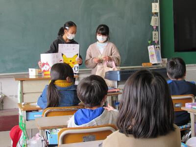 ◆休み時間、6年生が2年生へ「あいさつをしよう」と呼びかけているよ。