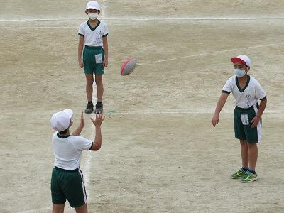 後半は、ラグビーボールを使って、投げる、取るの練習を始めたね。
