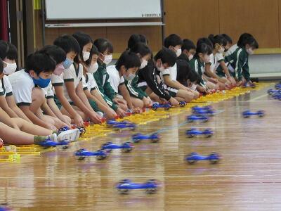 ◆ゴムの動力で、どこまで走らせられるか距離を測定する3年生!!