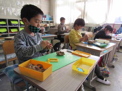◆1年生は、冬という季節からのイメージをねん土で表現しているよ。