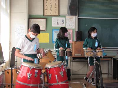 ◆音楽室では、3年生の太鼓の勢いのある音色が響いているよ。