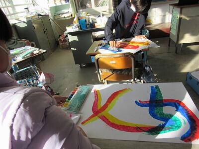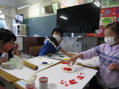 ◆1年生3クラスは、色々なスタンプに絵の具をつけて表現しているよ。
