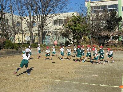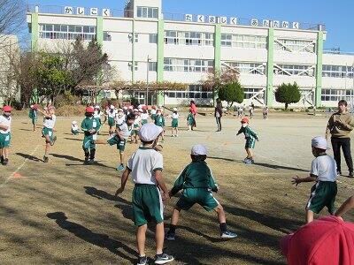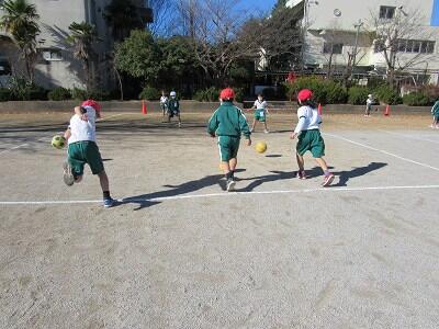 ◆4年生は、アメリカンフットボール型ゲームで校庭を走り回っているよ。