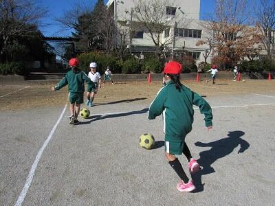 ◆1年生は、サッカーボールをドリブルしながら競走だよ。
