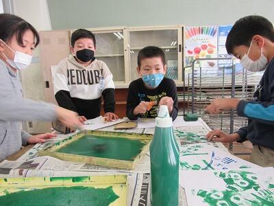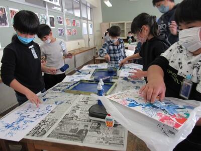 ◆多色版画に、さらに表現を付け足している3年生!!
