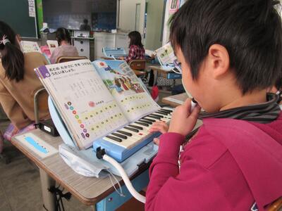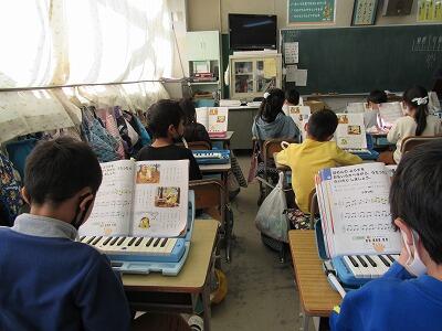◆2学期の鍵盤ハーモニカの演奏のまとめを行う1年生。