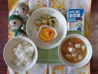 明日9月10日は十五夜で、この日の月を「中秋の名月」といいます。今日の給食はお月見献立です。お月見のときにお供えするさといもの料理や旬の果物の梨を使ったお月見梨ゼリーが出ました。