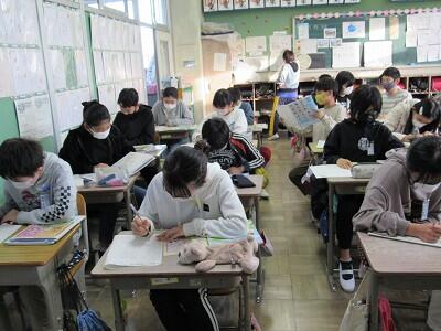 ◆午後の学校はいつもどおり。5年生は、書きぞめにチャレンジしているよ。