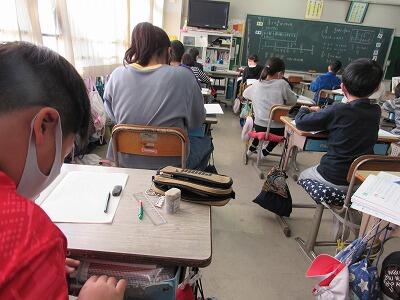 ◆3人の先生たちと「反比例」の学習に取り組む6年生。