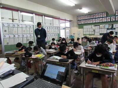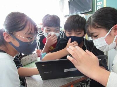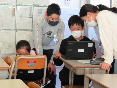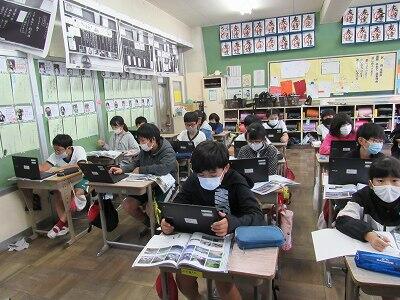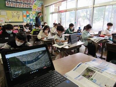 端末も活用しての検索を進める子どもたちを先生が支援していきます。