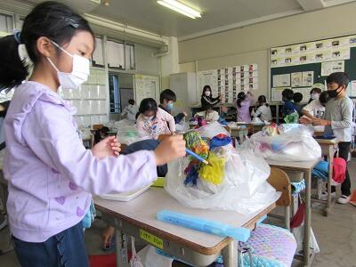 針金と発泡スチロールの立体に着色し、思い思いの表現を楽しんでいますね。
