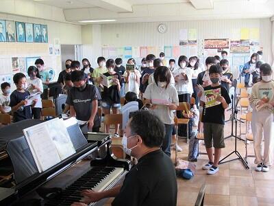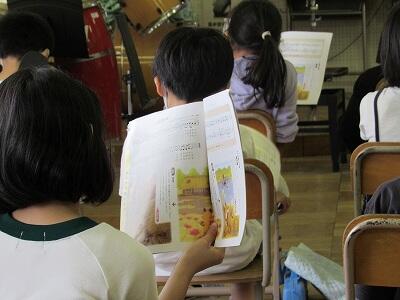 ◆音楽室で、「こきりこ」節を演奏する4年生たち。