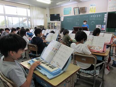 ◆鍵盤ハーモニカの指使いをマスターしようと挑戦中の2年生。