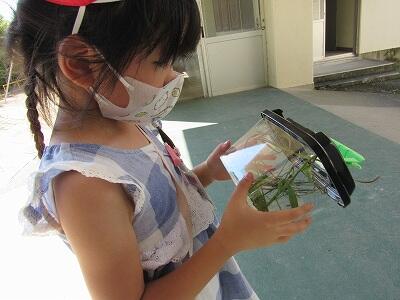 「何を捕まえたの?」 「小さなバッタです。持ってかえろうかな。」