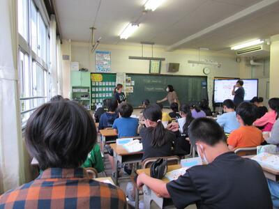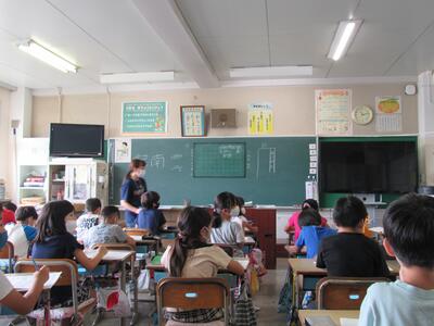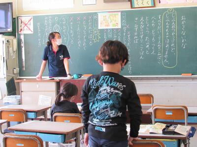 ◆2年生の教室では、教育実習生(栄養教諭)が給食の献立について授業をしています。