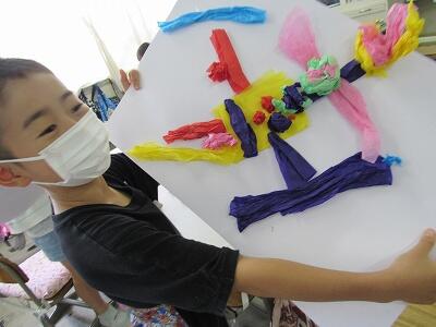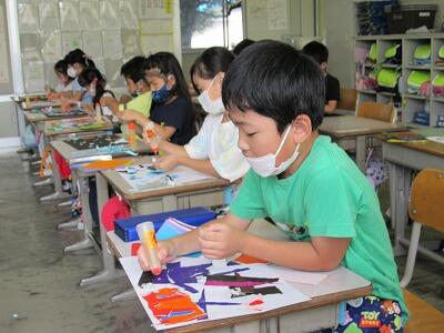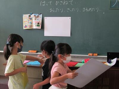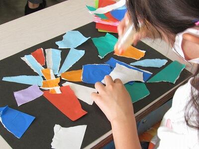 こちらの1年生も、折り紙を「ちぎって、切って、はり付けて」だね。