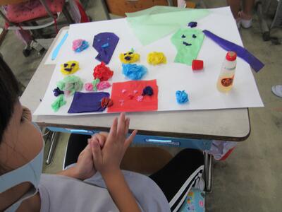 1年生は、折り紙をちぎって、切って、はり付けているよ。