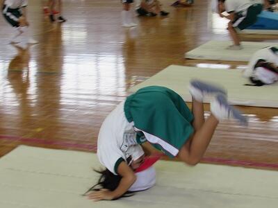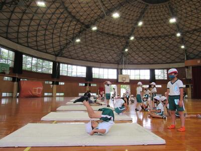 ◆幸松ドーム内では、1年生がマット運動をしているよ。