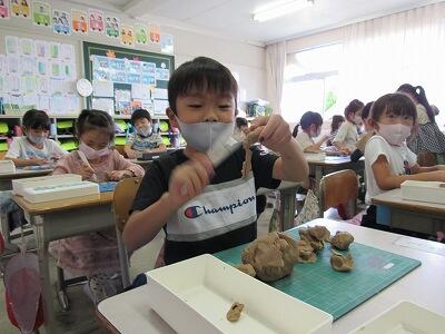 ◆1年生は、ねん土で「好きなものをつくろう」としているよ。