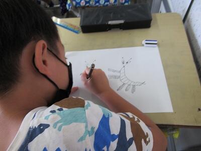 ◆2年生の生活科では、夏の虫(カマキリ)の写真を見て、その特徴をスケッチしているよ。
