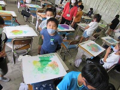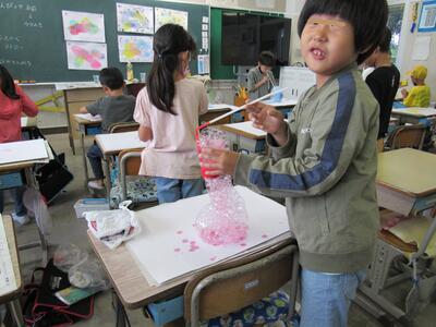 ◆こちらの2年生は、図工「いろいろ もよう」で、シャボン玉を画用紙に。