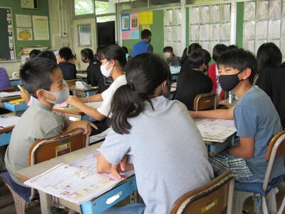 ◆5年生のイングリッシュタイムでは、2人組での対話が始まっています。