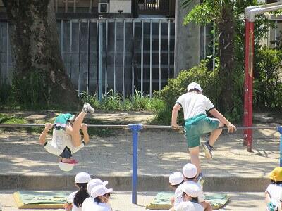 みんなに「腕立て後転」を演示です。とっても上手ですよ。