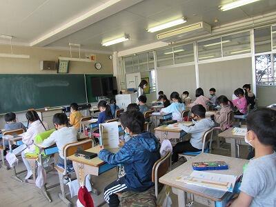 5年生の学年集会。高学年として6年生に追いつけ追い越せですね。