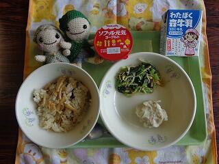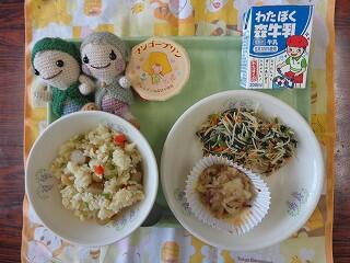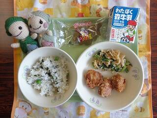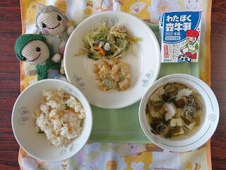 グリンピースわかめごはんのグリンピースは、2年生が1・2時間目にさやむきをしてくれました。グリンピースは今が旬の食品です。むきたてのグリンピースを調理したので、おいしく食べることができました。