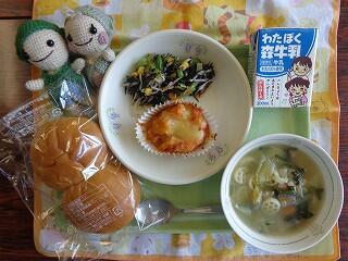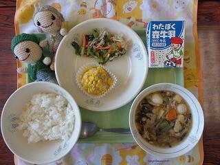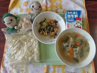 今日のスープは、入っている材料がしりとりでつながっています。こまつな→なると→とうもろこし→しめじ→じゃがいも→もやし→しお です。