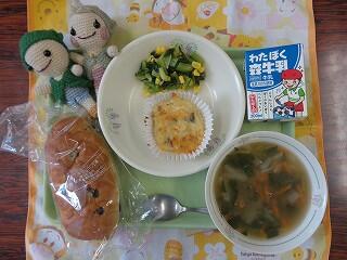 5月1日は幸松小学校148回目の開校記念日です。2月に2年生以上のみなさんに献立を選んでもらいました。パンは、幸松小オリジナルパンです。スープには春日部市の花「藤」をイメージした藤うどんがマカロニのように入っています。みんなで味わって食べました。