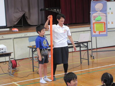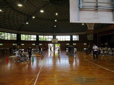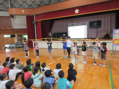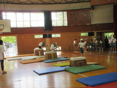 ★1、4年生は体育館で合同体育を行っていました。体力テストが近いので4年生が、1年生にいろいろと教えていました。