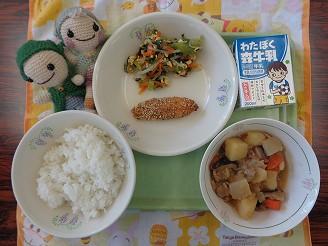 埼玉県行田市の郷土料理です。すりつぶしたじゃがいもに、ねぎ、にんじん、おからを混ぜ合わせて小判型にし、油で揚げたものです。給食室でウスターソースにからめてから出しました。ソースが染みたゼリーフライは、ごはんが進みます。