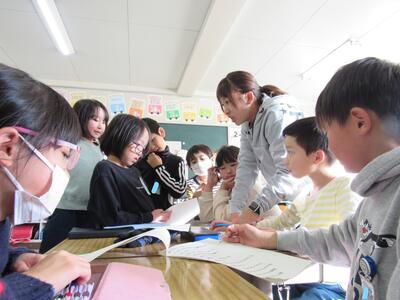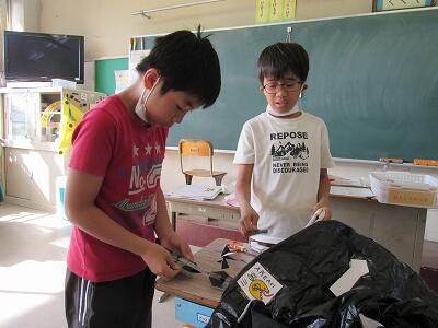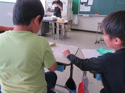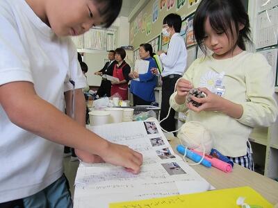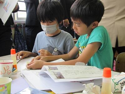 先生が材料集めのアイディアを広げ、子どもたちが友だちと一緒に考えているね。