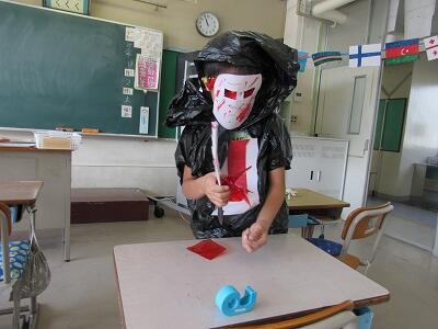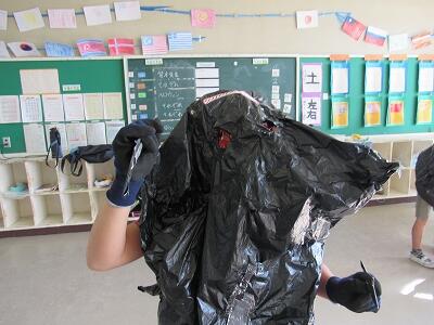 「校長先生、でき上りました。ガオー。」 「大きな口が開くんだね。」