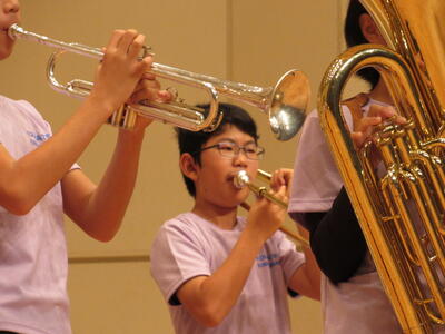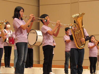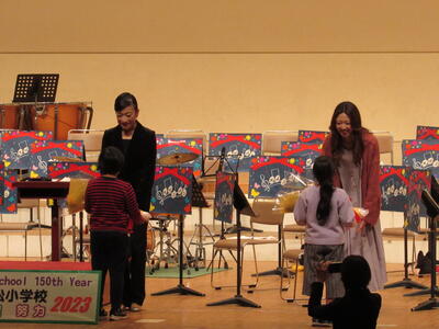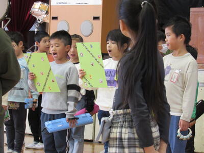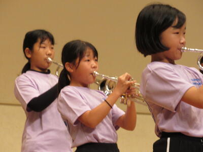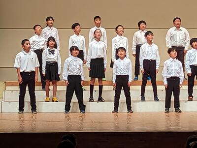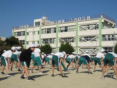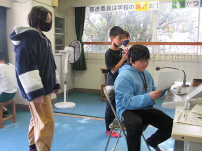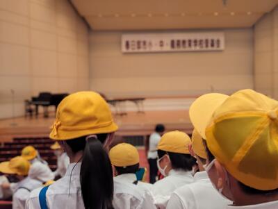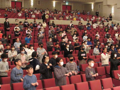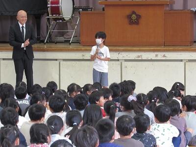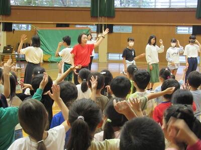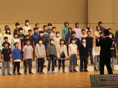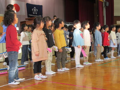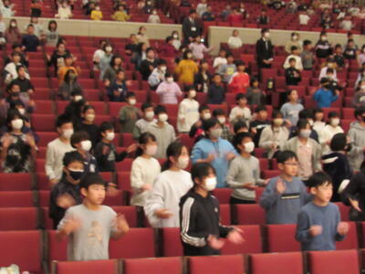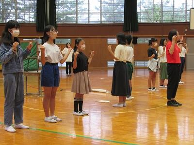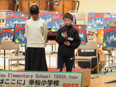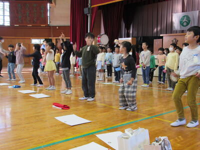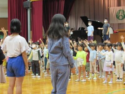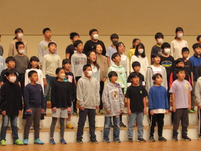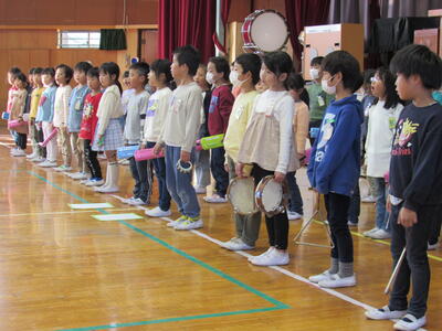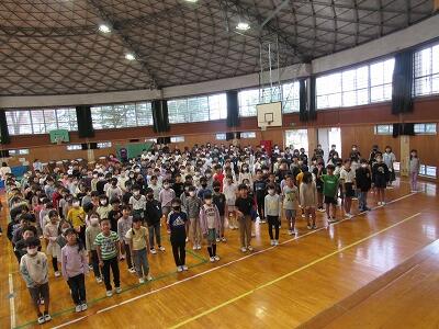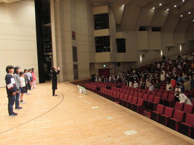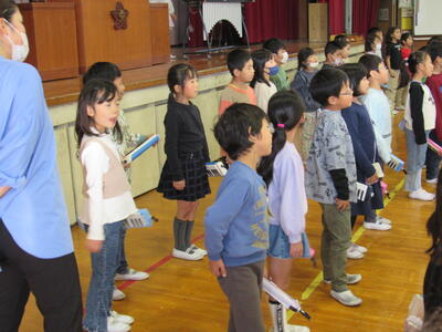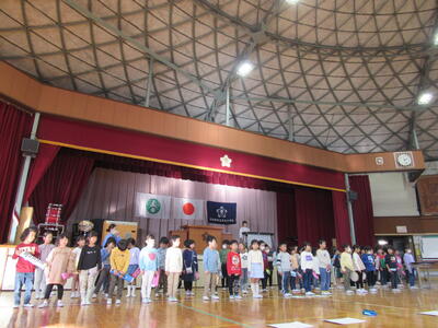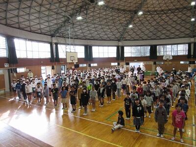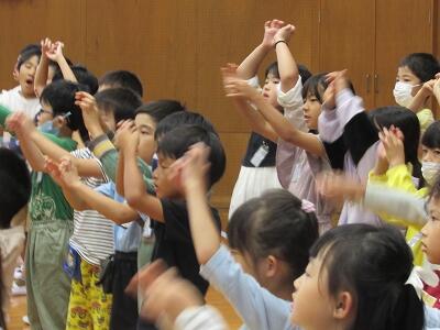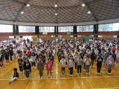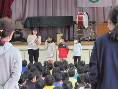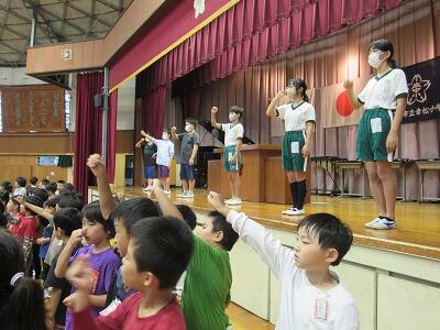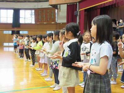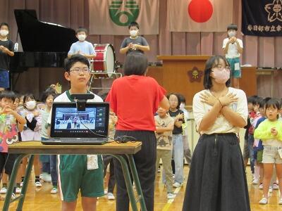 続いて、音楽委員会の5・6年生が、校歌や運動会の歌をリードしているね。