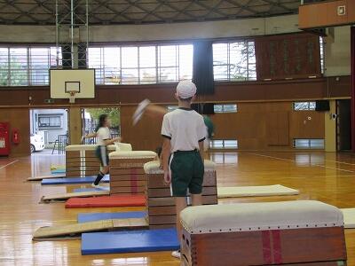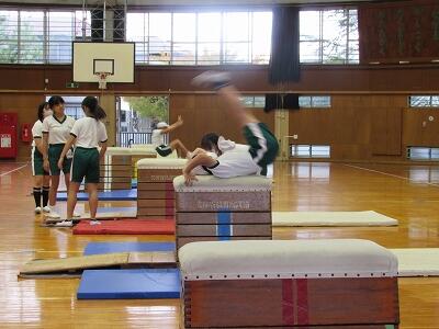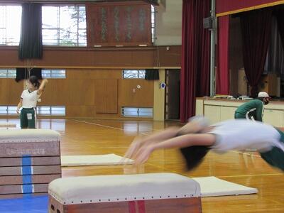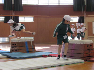 開脚跳びや台上前転などができるようになろうと、少しずつ技を高めているね。