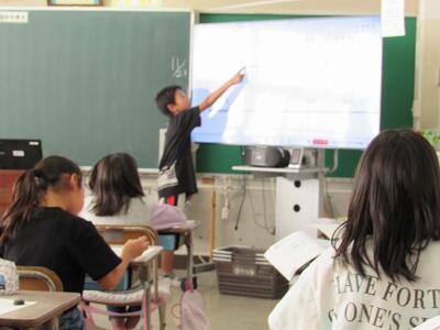3年生の算数は、みんなで黒板の図を見ながら、自分の考えを紹介し合っているよ。