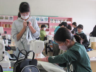 ◆家庭科室では、5年生がミシンの使い方を習得しようとしているよ。