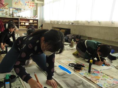 ◆となりの6年生は、「感謝」の気持ちを込めて、毛筆をしているよ。