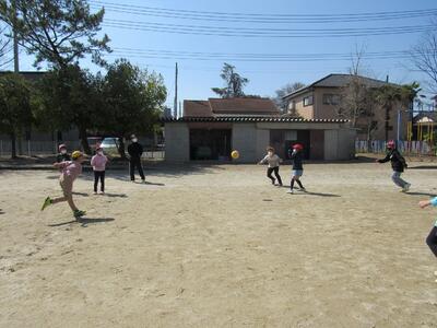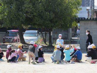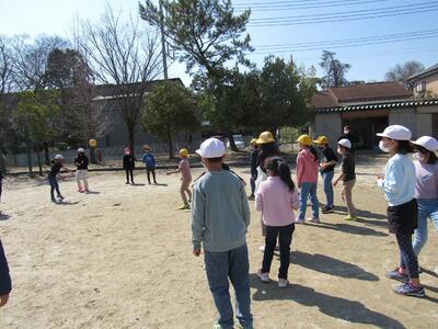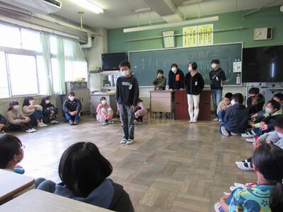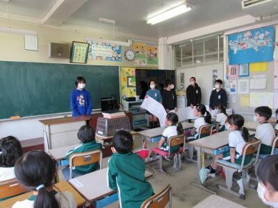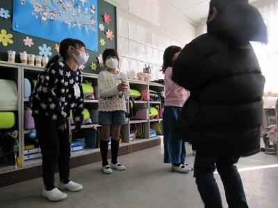 ◆休み時間、6年生が2年生へ「あいさつをしよう」と呼びかけているよ。