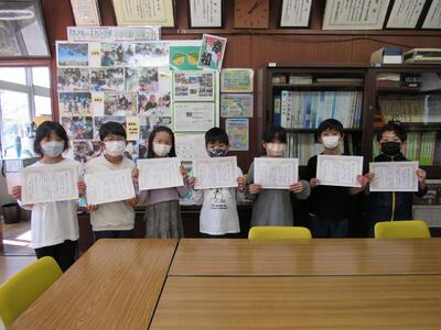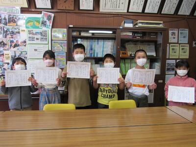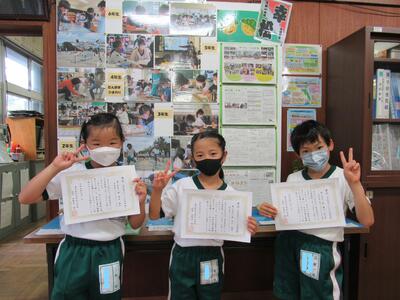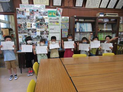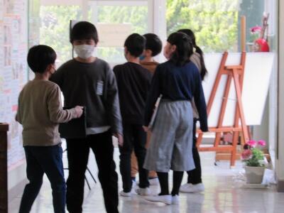 ◆業間休み、「校長室の小さな美術館(5~6月)」の表彰に1年生が校長室へ。