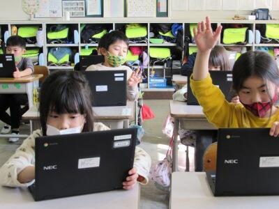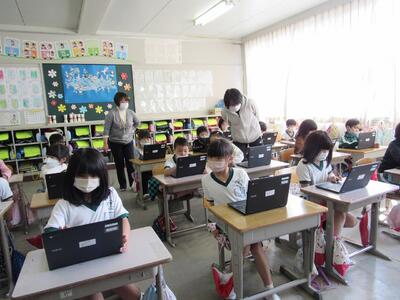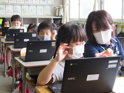 ◆1年生は、ICT支援員の先生とパソコンのレベルアップを図っているよ。