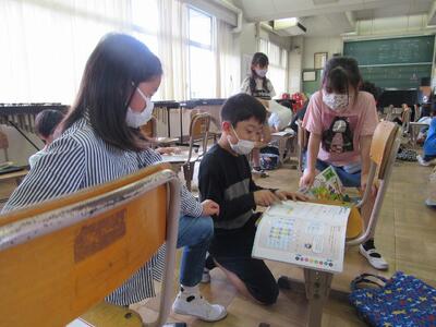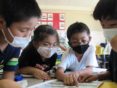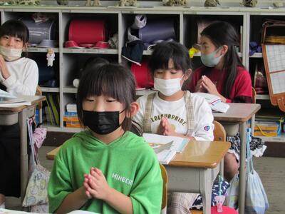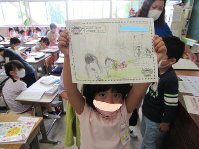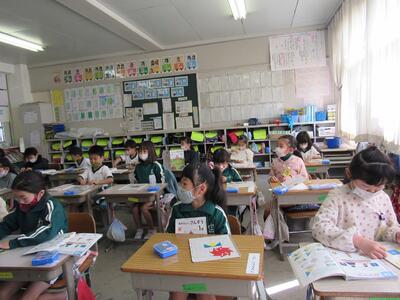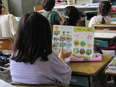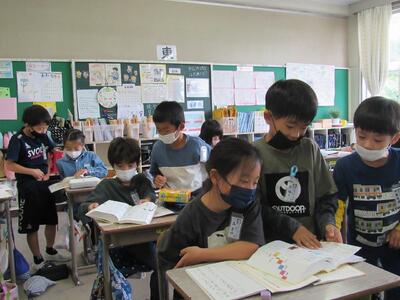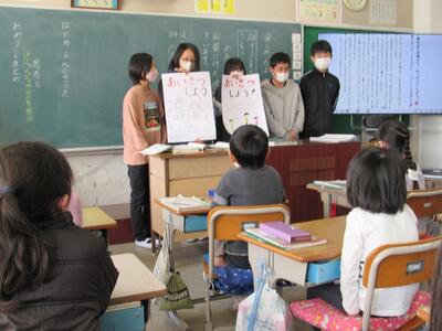◆1年生は、「おむすびころりん」などの昔話を読んでいるよ。