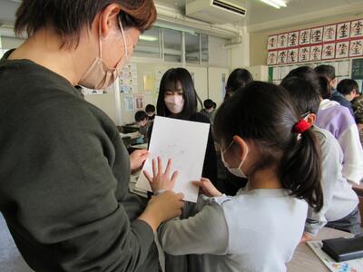 ◆となりの3年生は、鉛筆を使って、自分の手を画用紙に描いているよ。