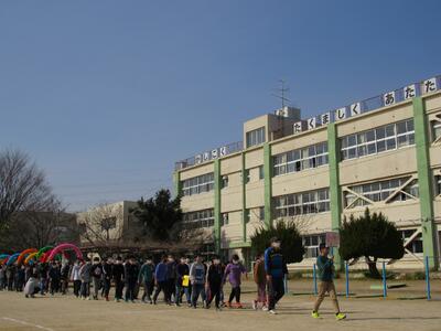 オール幸松小児童が集まる最後の集会活動。6年生が堂々と歩いて見送られているね。