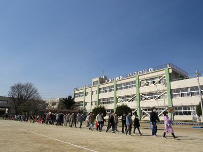 ◆青空の下、「6年生を送る会」が始まっているよ。4年生が持つアーチをくぐり、6年生が入場!!