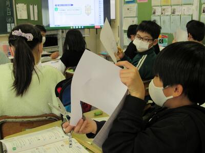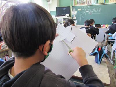 ◆5年生の算数は、三角柱の展開図を工作用紙に書き、実際に組み立てていこうとしているよ。