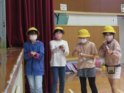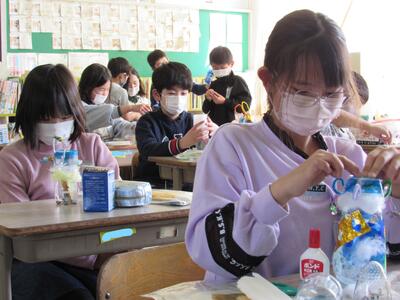 ◆4年生の図工は、色の着いたセロファンなどを使って光るオブジェを作っているよ。