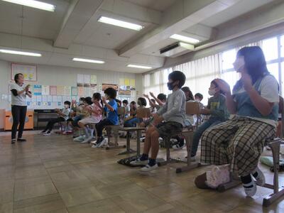 ◆2年生は、曲に合わてリズム打ちに取り組んでいるよ。